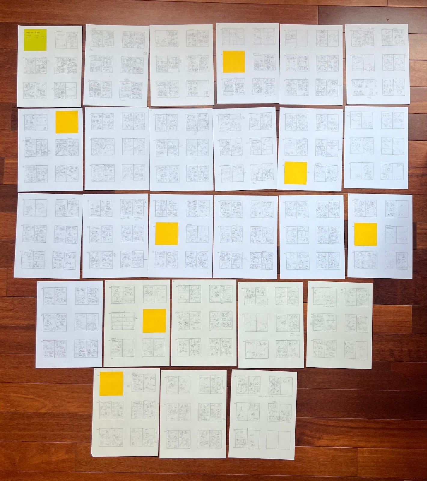 This is where the sticky notes came in. If a page needed edits, I’d slap a sticky note over the thumbnail and draw directly on it. That way, I didn’t have to erase large sections of work, and I could refer back to anything I’d previously drawn by peeking under the sticky note.