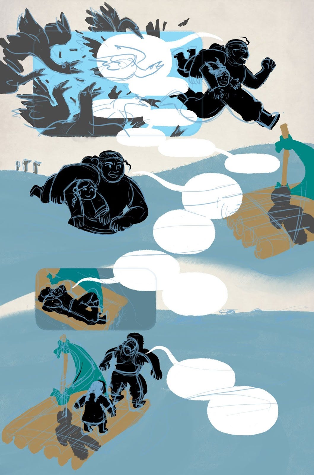 Pointy shapes that resemble arrows, such as the angry stonefowl’s beaks, point the reader towards where they should be looking. In the top third of the page, they point towards Shan and Lu. From there, the speech bubbles move downwards and rightwards before swooping back left, where you see Shan carrying Lu.