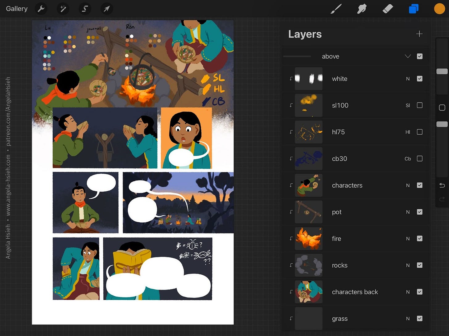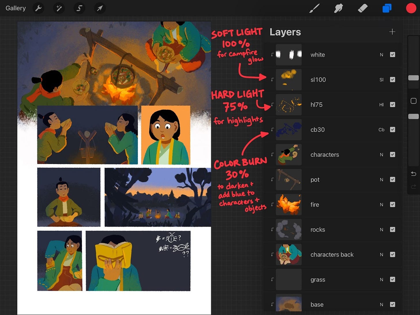 The characters’ base palettes are chosen based on how they would appear in neutral white light. Most scenes don’t take place in neutral white light, so I use layer modes to adjust the characters’ colors so that they harmonize with their environment. Below is an example of a nighttime scene around a campfire that shows the effectiveness of layer modes.